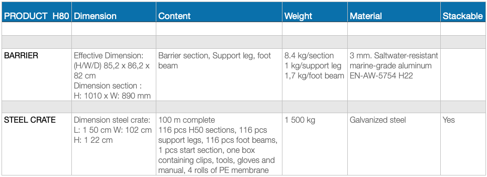 Normally INERO™ H80 is delivered in the following way: 100 metre complete barrier including fittings comes in stackable cargo pallets. A pallet containing 100 metre barrier weighs 1500 kg. The steel pallet measures 1500 mm x 1000 mm x 1100 mm. A container holds 700 metre H80 barrier.